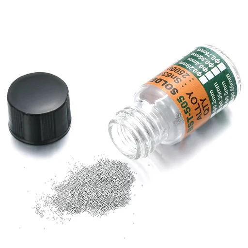 Soldadura de Estaño en Bolas – Esferas 0.35mm Sn63/Pb37 de alta calidad, ampliamente utilizadas en la reparacion de Circuitos Impresos PCB, Baquelas, Baquelitas, Servicio Tecnico en Telefonia Celular, Computadores PC, Laptops, BGA (Ball Gray Array) – Reballing